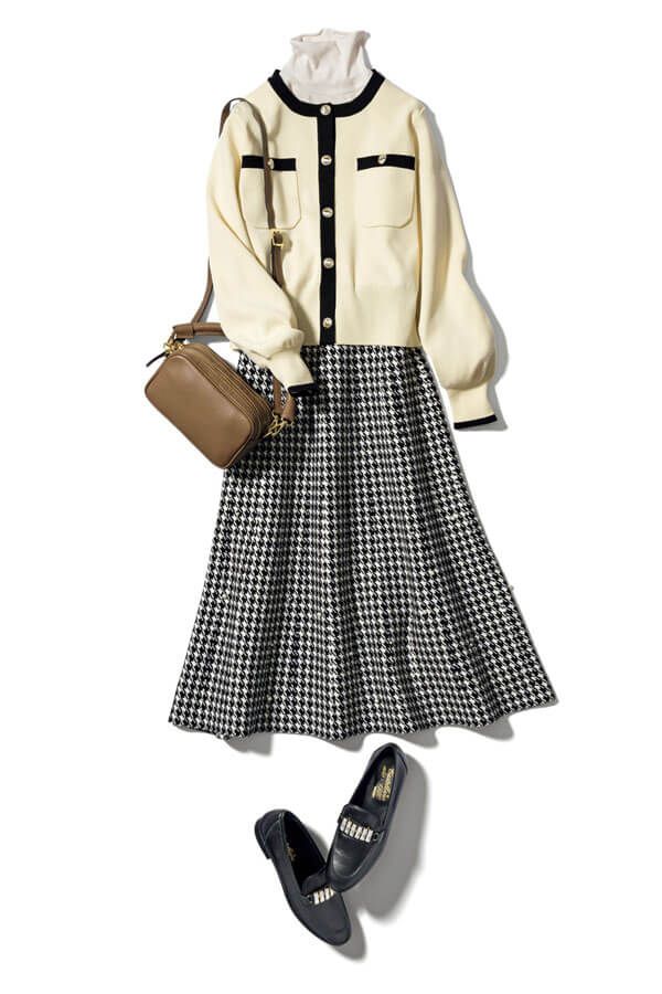 ニットジャケットを羽織って上品にまとめるとさらに高見え。ふんわりと広がる、冬らしい千鳥柄のフレアスカートはニット素材で動きやすさも◎。配色ニットジャケットやローファーで、レトロムードにさらに拍車をかけて。