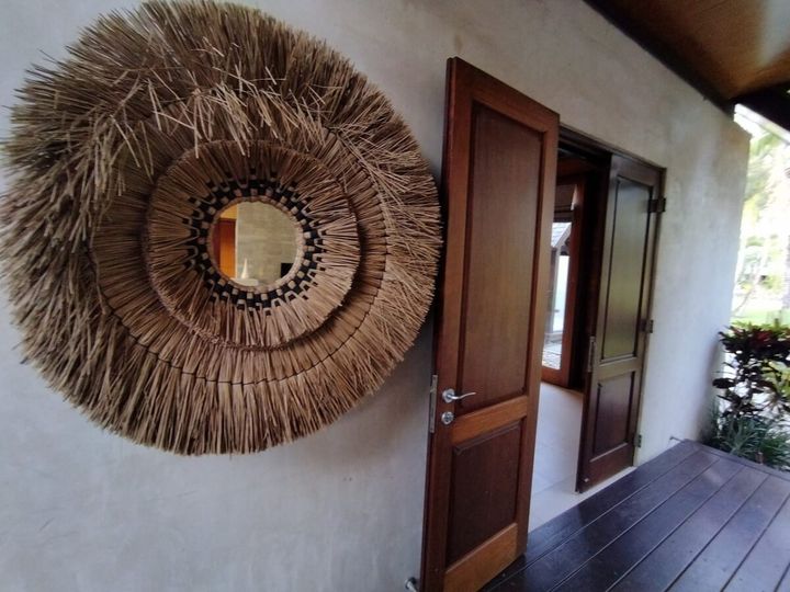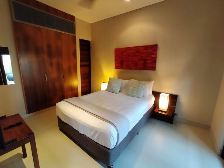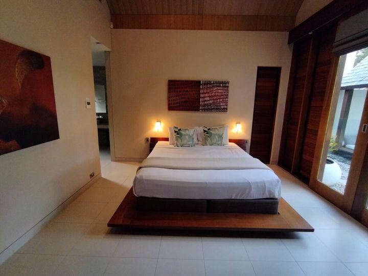 こちらが2つ目のベッドルーム。クイーンサイズのベッドが配され、ヴィラ全体にいえることですが、砂岩や石灰岩、木などの自然素材を巧みに組み合わせたアースカラーの優しい客室が素敵。
