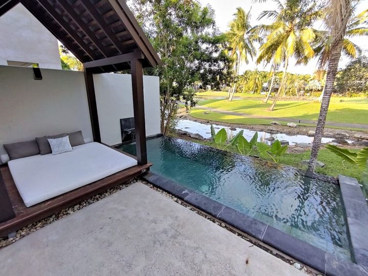 インフィニティプールも魅力ですが、ガゼボ付きのプライベートプールなら、誰にも邪魔されることなく思いのまま楽しめちゃいます。ヴィラは、この芝が美しい池に面した庭園側と緑が迫る熱帯雨林側があるのですが、ヌケ感のある眺望を楽しみたいなら庭園側がおすすめ。レセプションから近いヴィラなら、カートに乗ることなくお散歩気分で行き来できるので、ぜひリクエストしてください。