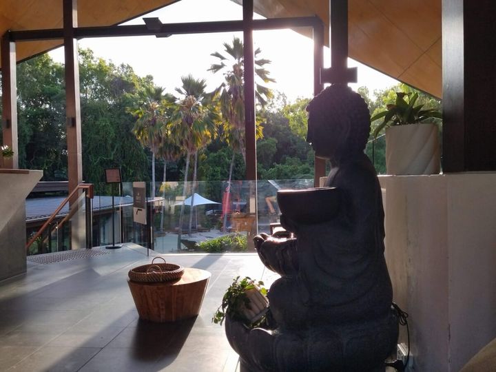 三角屋根が特徴的なホテルのアプローチ。レセプションには仏像が配され、なんだかアジアンな心をくすぐる「Niramaya Villas&Spa(ニラマヤ ヴィラ&スパ)」。