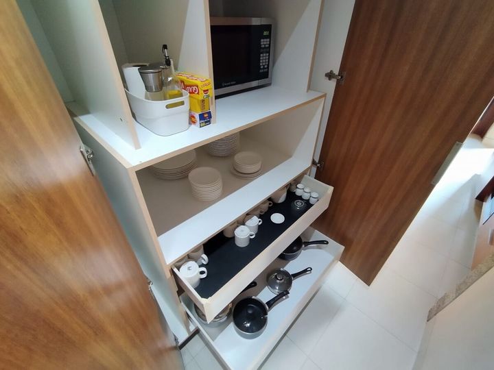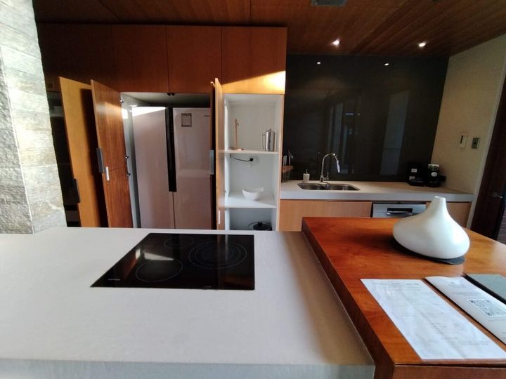 電気コンロはもちろん、木の扉を開くと、大型冷蔵庫や電子レンジ、オーブンなども備わっており、食材を買い出しして本格的な料理を楽しむことも。