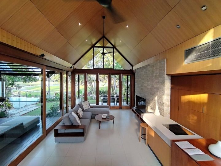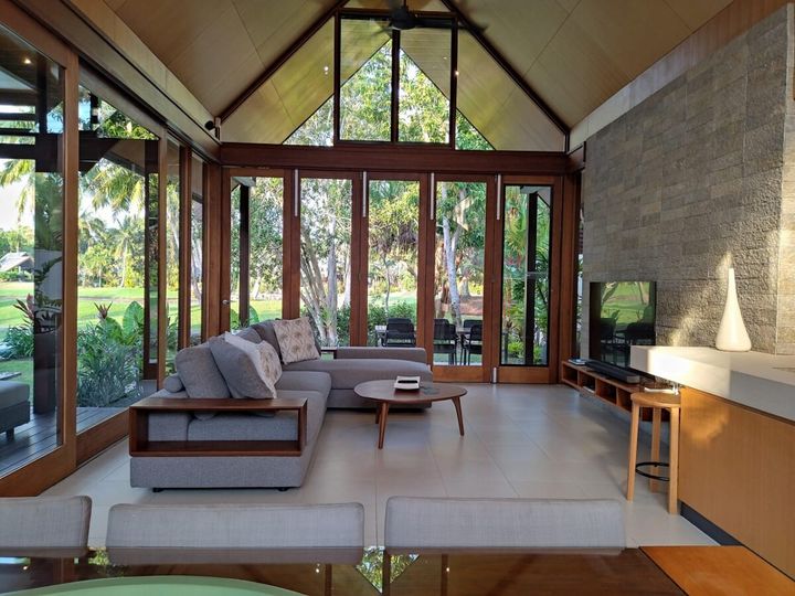 高い天井にプロペラ扇風機が回るリビングも広々。ガラス面が多用され、庭園の緑がシームレスで屋内とつながるようなすがすがしさ。