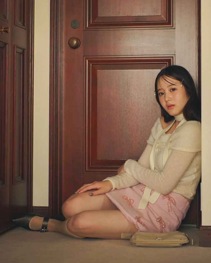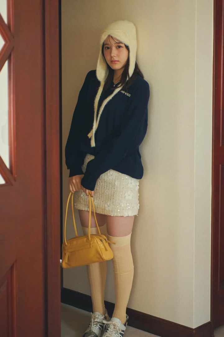 リボンツイードミニスカート 16,280円/シスタージェーン(ザ・ウォール ショールーム)タイつきオフショルニット 11,200円/ノットユアローズ、バッグ 12,230円/ヨミム(ともにHANA)ヘアクリップ(2個セット)1,760円/GOLDY ソックス 1,210円/靴下屋(Tabio)パンプス 9,900円/チャールズ&キース(チャールズ&キース ジャパン)