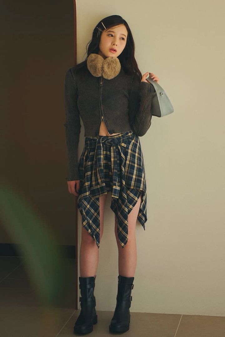 チェック柄ミニスカート 8,470円/ACLENT ジップニット 6,930円/EMODA ルミネエスト新宿店 ヘアピン(2本セット)1,320円/アネモネ(サンポークリエイト)イヤーマフ 5,500円/オーバーライド(OVERRIDE 神宮前)バッグ 22,000円/カルバン・クライン ジーンズ(カルバン・クライン)ブーツ 29,700円/ダイアナ(ダイアナ 銀座本店)