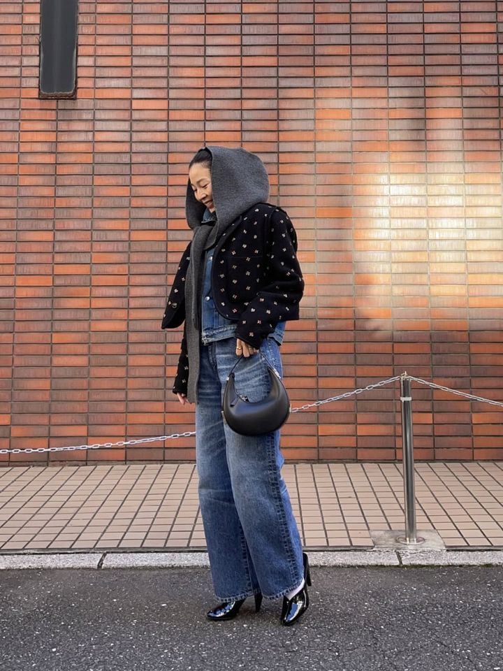 「このストールは寒さ対策だけでなく、被らずにフーディーのように見せたいときに、フード部分がしっかりと立体的になるところが優秀なアイテム。今回は、ショート丈のジャケットとデニムジャケットのレイヤードスタイルに合わせてコーディネートしました。フードストールがなくても成立しますが、これがあることでひとくせアクセントにもなり、防寒も叶えてくれるので◎。全体的にカジュアルウェアの要素が多いため、シューズとバッグはブラックにすることで女っぽさを取り入れています」
