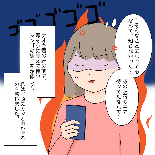 「・・・そんなことになってるなんて、知らなかった・・・。あの吹雪の中で待ってたなんて・・・」カイトくんママから話を聞いたシンゴくんママは、ナオキくんの家の前で寒さに震えて待つシンゴくんの姿を想像し、怒りがこみ上げます。