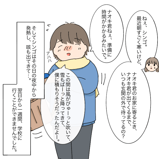 帰宅したシンゴくんに「ねぇ、シンゴ。最近朝すごく寒いけど、ナオキ君のお家に寄るとき、ナオキ君が出てくるまでいつも玄関の外で待ってるの?」と聞くと、「ナオキ君ねぇ、準備に時間がかかるみたいで。この間は風がびゅーっと吹いて、雪もばーっと降ってきて、僕に積もりそうだったんだよー」と話してくれました。そして、その日の夜中から発熱し、咳も出てきたシンゴくんは、翌日から一週間学校に行くことができませんでした。