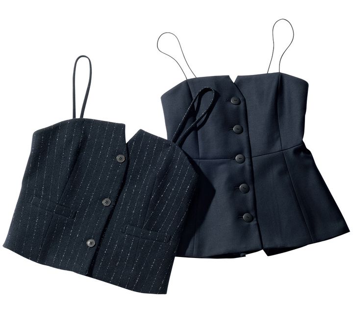 〈右から〉テーラードベスト感覚で使える1枚。ビスチェ¥39,600(ザ サードマガジン/サードマガジン)仕事や学校にも使い勝手のいいネイビーストライプ。ビスチェ¥31,900(カデュネ/カデュネ プレスルーム)