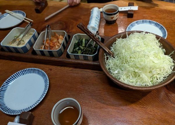 ランチの定食を頼むと、3種類のお漬物と千切りキャベツがお代わり自由です。