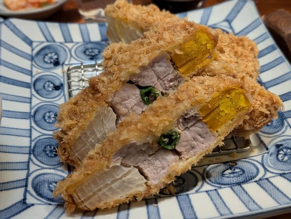 断面もとてもきれいで、中身は、豚(ヒレだそです)、かぼちゃ、玉ねぎ、真ん中のグリーンはしし唐のよう。