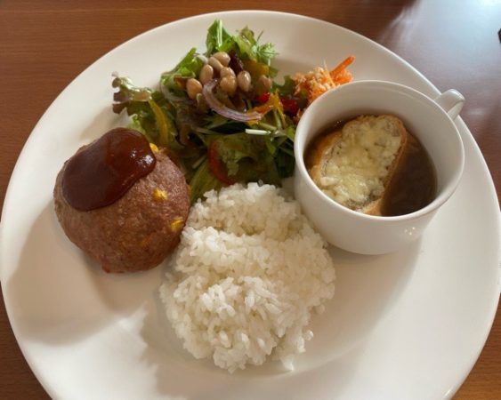 エッグインハンバーグをたのみました。スープはオニオングラタンスープで、あめ色のたまねぎとスープシミシミのパンにチーズで温まります。サラダはシャキシャキ生野菜と人参ラぺです。