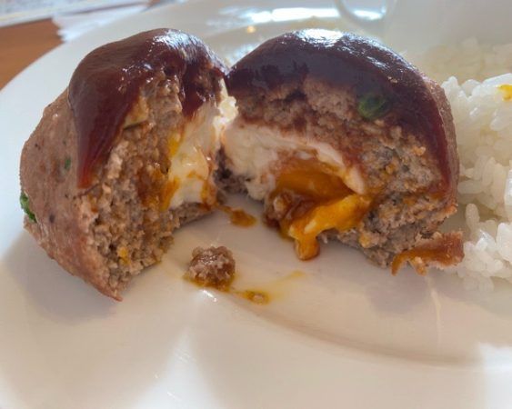 そしてコロッとまんまるエッグインハンバーグ!ミックスビーンズ入りで、切るとトロッと卵が出てきました。お豆腐入りなのですが食べ応えがあります。