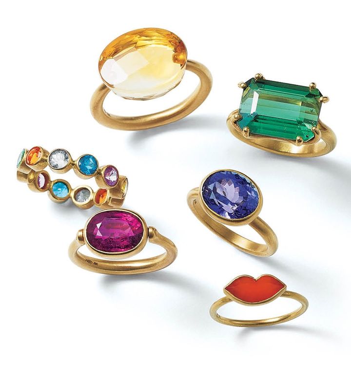 プリンセス リング〈右手人さし指〉[タンザナイト×YG]¥1,010,900、スイヴィル リング〈右手薬指上〉[ルベライト×YG]¥1,468,500、スモール テンダー・キス リング〈右手薬指下〉[カーネリアン×YG]¥172,700、カボション リング〈左手人差し指〉[シトリン×YG]¥641,300、ジョアンC.リング〈左手中指〉[グリーントルマリン×YG]¥1,323,300、ボリウッド リング〈左手薬指〉[マルチカラー×YG]¥562,100(全てマリーエレーヌ ドゥ タイヤック/MHT)、ニット¥79,200(フォルテ フォルテ/コロネット)*マルチカラー(ピンクサファイア、イエローサファイア、ファイヤーオパール、ツァボライト、タンザナイト、アパタイト)