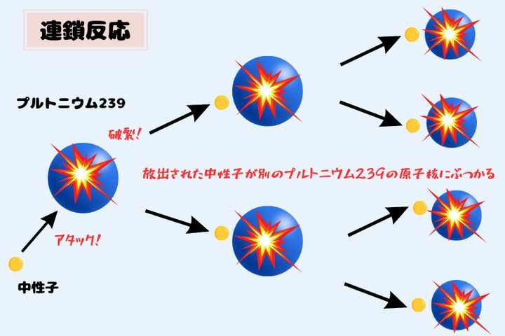 この中性子が近くにある別のプルトニウム239にぶつかると、また同じような核分裂反応がネズミ算式に広がります。