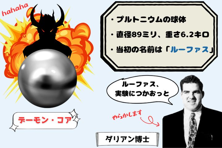 プルトニウムの球体は当初「ルーファス(Rufus)」という友達みたいなコードネームで呼ばれていたのですが、のちに「デーモン・コア(悪魔の核)」というイカつい名前に改称されるきっかけとなる惨事を引き起こすのです。