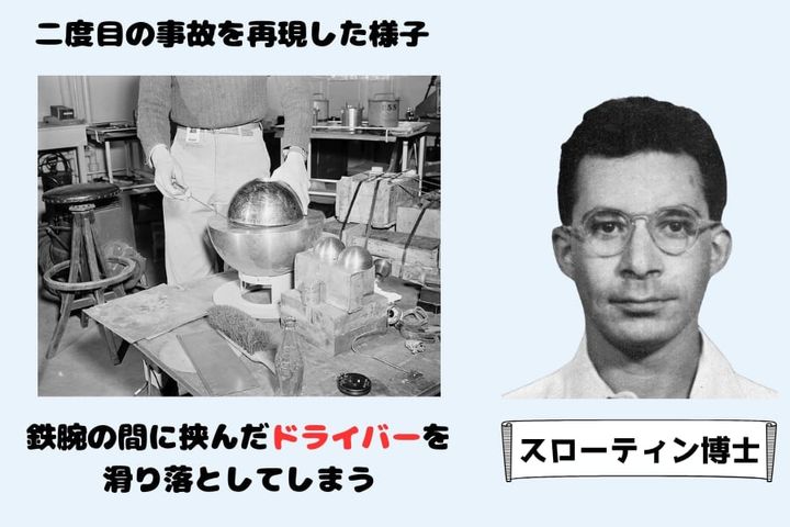 1946年5月21日、スローティンは手を滑らせてマイナスドライバーを落としてしまい、その瞬間にダリアンの時と同じく、青白い閃光が研究室を駆け抜けました。