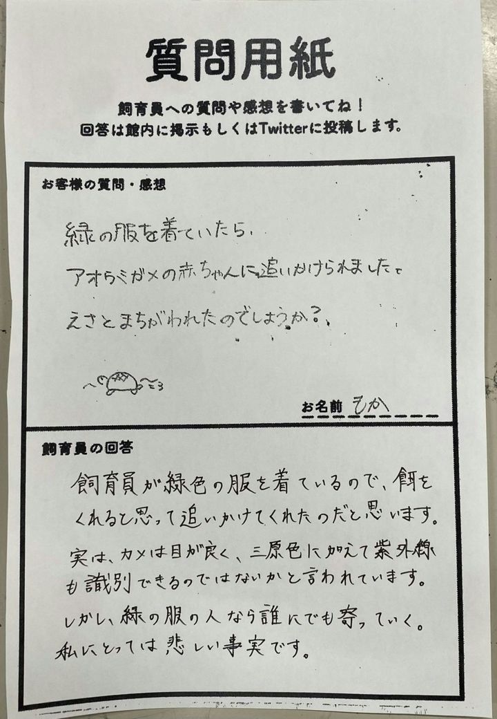 この回答に「悲しまないで…(笑)」や「飼育員さんのカメへの愛情を感じます」などのリプライが寄せられました。ウミガメの生態を知るだけでなく、いかに愛情を持って活動しているかも知ることができる投稿ですね。