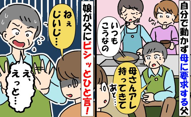 やがて夕方になり母と2人で晩ごはんの準備をしていると、テレビを見ていた父が「母さん、アレ持ってきて!」「○○はないのか?」と座ったまま母にいろいろと要求してきます。母は怒って「お父さんはいつもこうなのよ! ほんっとイライラする!」と言って、娘に向かって「じぃじダメだね〜! 自分勝手だから、ばぁばはもう一緒に暮らしたくないな! 孫ちゃんのところに引っ越そうかしら」と言いました。