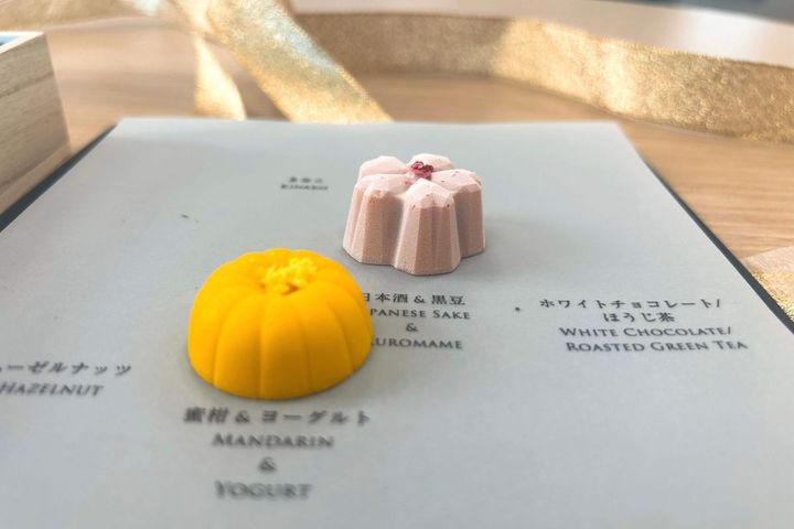 そのほか、日本の国花である桜と菊も。桜は、日本酒を入れたカカオ分の高いガナッシュに黒豆の甘露煮がひと粒入った「日本酒&黒豆」のチョコレート。口に入れるとほんのり日本酒の香りが鼻に抜け、黒豆の和の甘さが絶妙なマリアージュを生み出します。