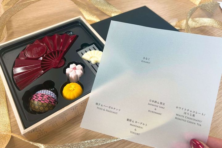 新作商品に加えて定番スイーツにも、さまざまな和のモチーフが見られます。華やかな舞を想像させる扇型のチョコレートや、まるで上生菓子のようなボンボンショコラなどが入った「舞い扇」3700円は、ひと箱にさまざまな和のエッセンスが込められています。
