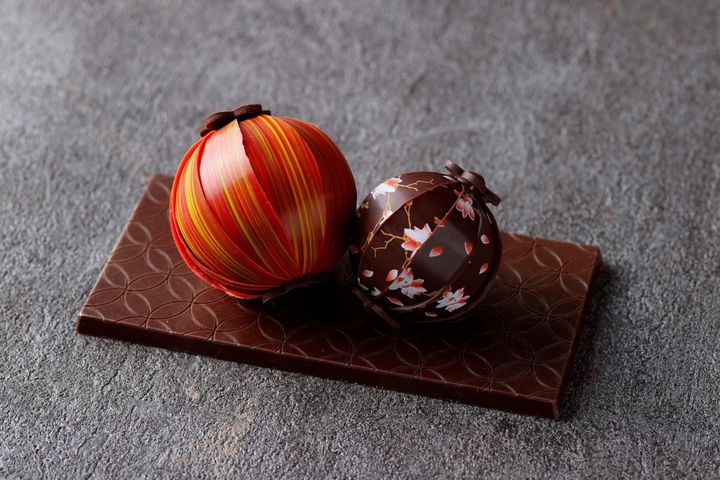組み紐模様や花柄などかわいらしい見た目が特徴の「手毬チョコ」4200円。ホテル館内のような、“和”のしつらえを感じる空間にぴったりのビジュアルです。