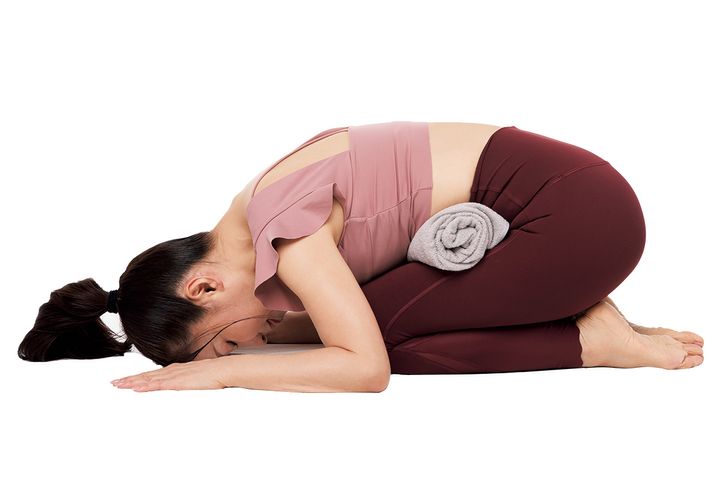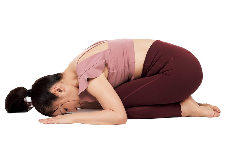 かかとをしっかりお尻につけるのがポイント。背中が硬くてお尻が浮く人は、おでこの下に握りこぶしを入れて調整を。
