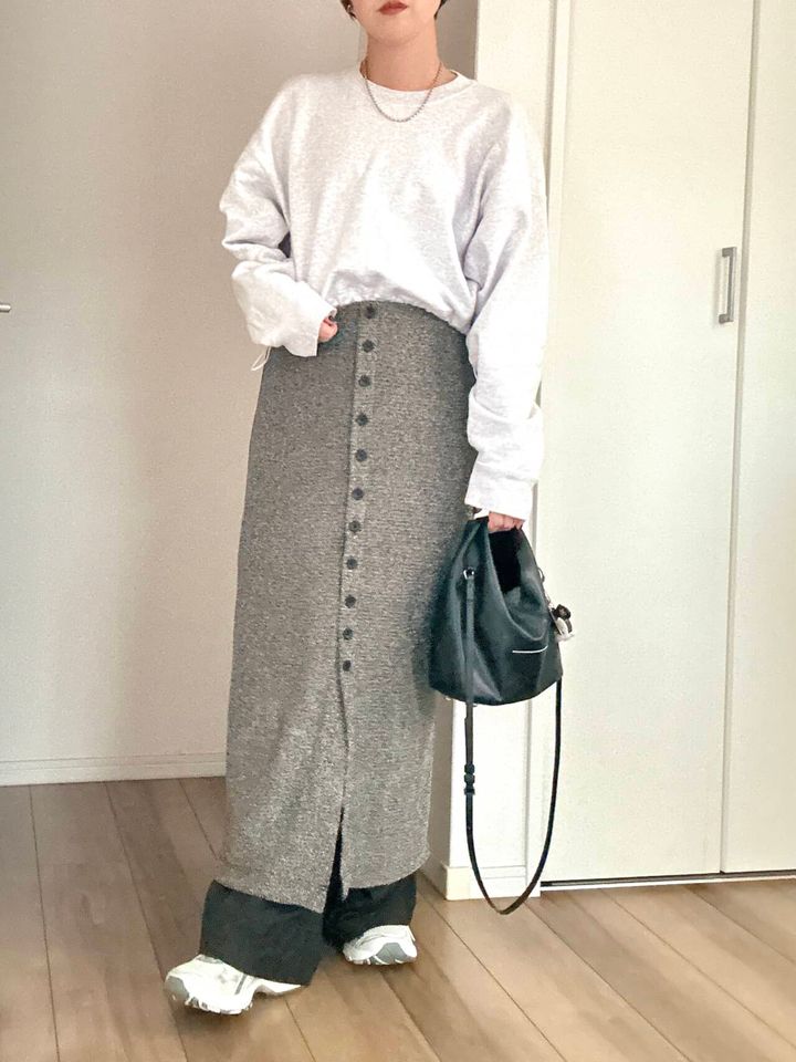 1枚でインパクトの強いラメスカートだからこそ、他をスウェットやスニーカーなどを合わせて程よくカジュアルダウンすると、バランスの良い着こなしに。また、グレースウェットはデザイン性があるものや短丈のものを選ぶのもポイントになります。
