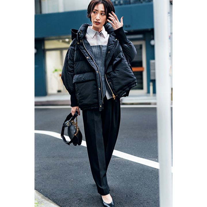 シャツ¥44,000(ル フィル/ル フィル ニュウマン 新宿店)ビスチェ¥17,930パンツ¥22,000(ともにアダム エ ロペ)ダウンジャケット¥148,500(タトラス/タトラス コンセプトストア 日比谷店)ピアス¥132,000(ヴァンドーム青山/ヴァンドーム青山 プルミエール 伊勢丹新宿店)リング¥15,400(ヴイエー ヴァンドーム青山/ヴイエー ヴァンドーム青山 有楽町マルイ店)バッグ¥209,000(ザンケッティ/八木通商)パンプス¥64,900(ペリーコ/アマン)