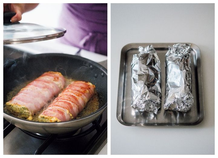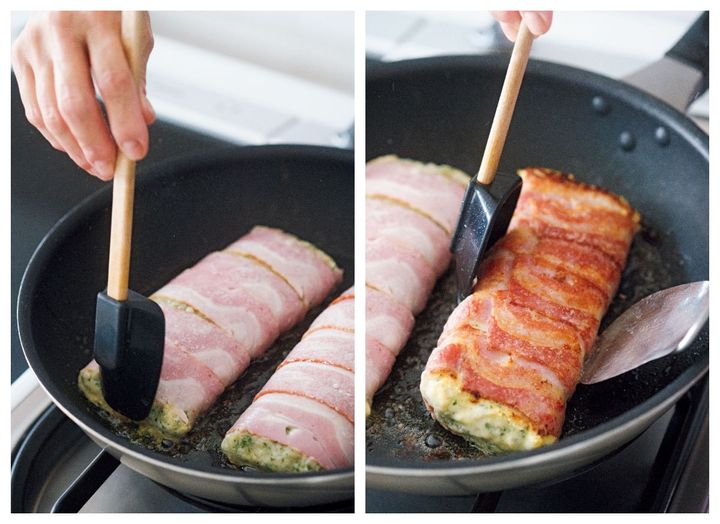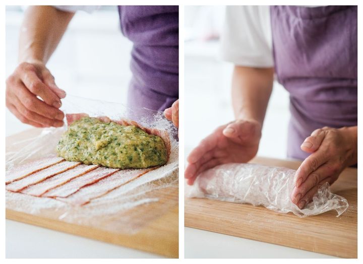 まな板に30cm四方のラップを広げ、全体に小麦粉を薄くふる。ベーコン5枚を、1cmずつ重ねながら縦長に並べ、表面にも小麦粉を薄くふる。手前に(1)の1/2量をのせてなまこ状に成形し、直径6cmになるようラップごとベーコンをしっかりと巻く。巻き終わりを下にし、両端からはみ出たたねは手のひらで押さえてベーコンの中に納める。残りも同様にする。