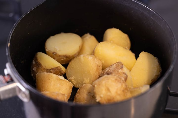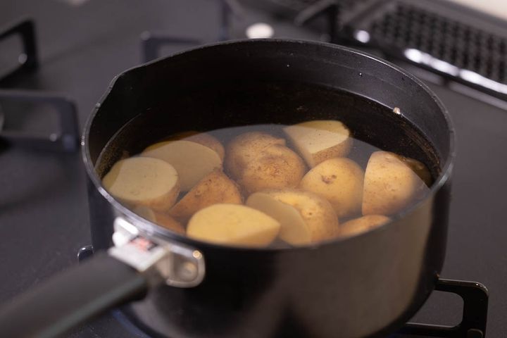 2、鍋に1と水を入れ中火で加熱する。沸騰したら弱火にして10分煮る。竹串が通ったら、湯を捨てて中火にかける。鍋をゆすり粉が吹くまで水分を飛ばす。