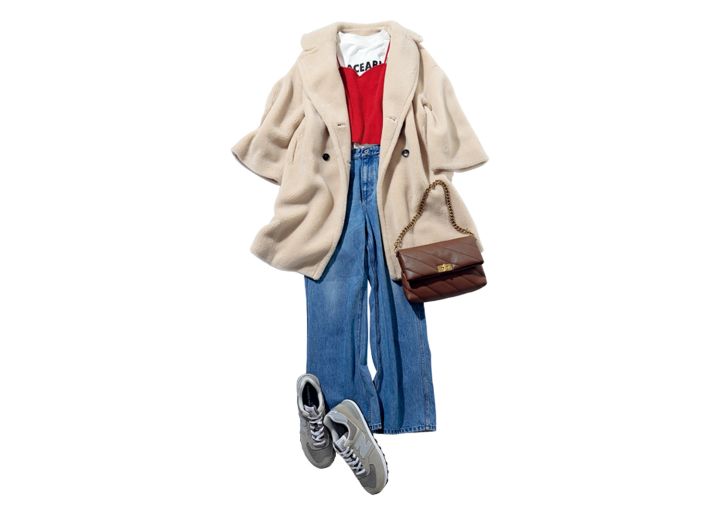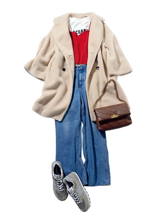 足元スニーカーにボアを羽織って颯爽とおでかけ。脱ぎ着しやすく疲れないよう、軽量化を考慮したコーデはアクティブに過ごしたい日にぴったり。裾にビンテージ加工が入ったデニムは履くだけで今っぽいシルエットに。