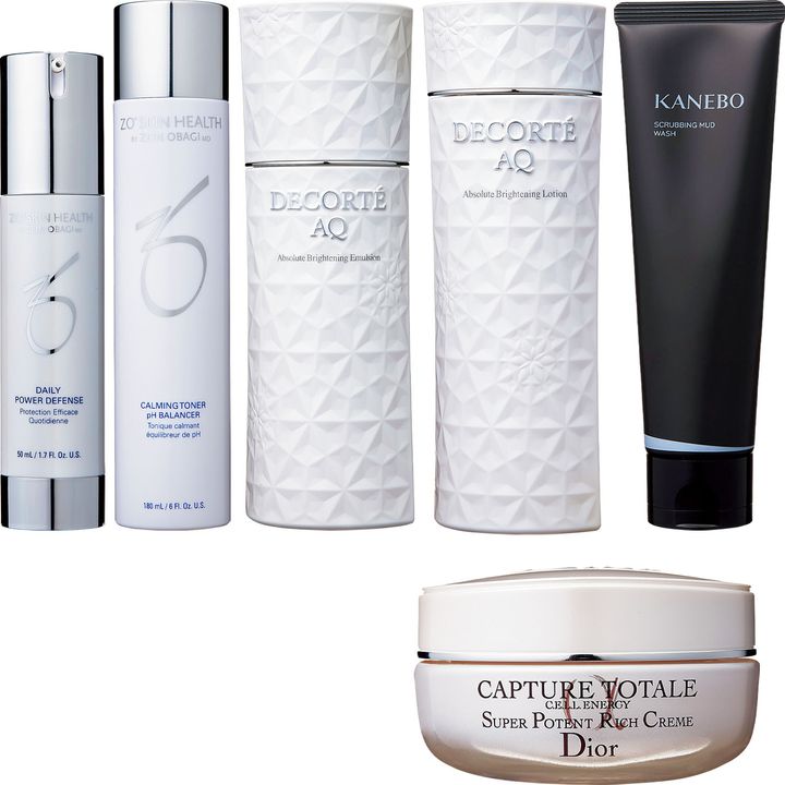 肌状態を見ながらアイテム決め。左から:ゼオスキンヘルスのデイリーPDとカーミングトナーのW使いで確実に透明感とハリがUP。週一でカネボウのクレイ洗顔で毛穴汚れをオフ。AQ エマルジョンで肌を柔らかくしてからローションで潤いをプラス。下:Dior カプチュールトータルは高保湿な濃厚クリームで、肌の奥まで潤いで満たしてくれます。