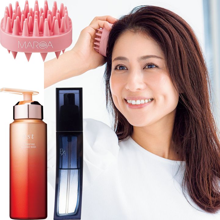 MAROAのスカルプケアブラシで頭皮刺激し、頭と顔のむくみをOFF。エストで洗顔後、ポーラのローションで保湿を。