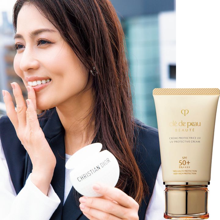 Dior ル ボームで口元や手を常に保湿。首元はクレポのUVで紫外線ケアを。