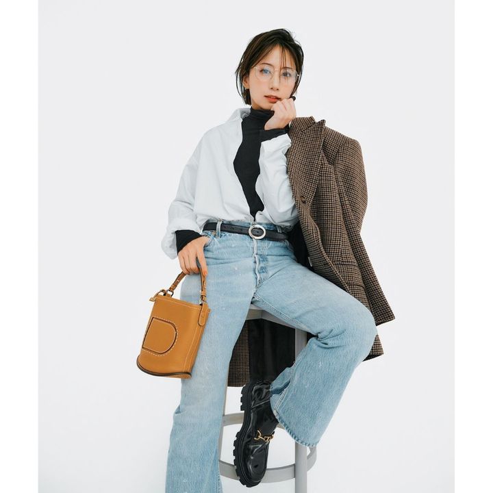 トレンドカラーの重ね技で 奥行きのあるスタイリングに。 茶系小物で全身トーンをなじませて