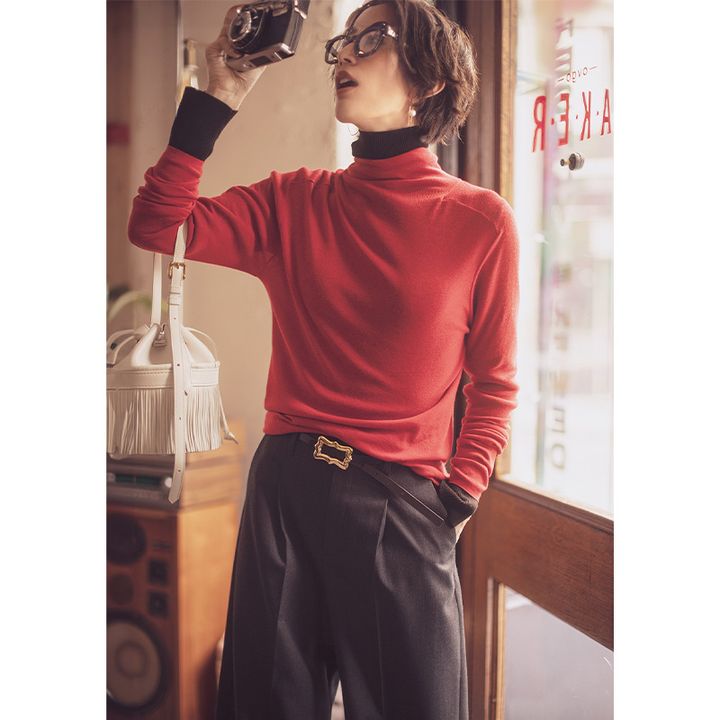 ほっこりしがちな赤ニットは 黒タートルで引き締め効果をプラス。 グレーパンツで配色バランス◎