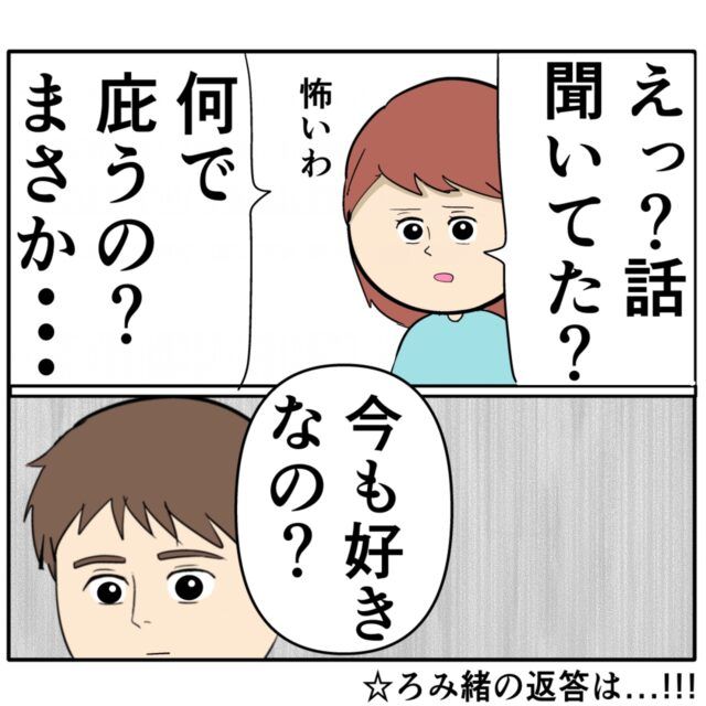 「え?話聞いてた?なんで庇うの?」めいさんはろみ緒さんの反応に違和感を覚え、「まさか・・・今も好きなの?」と聞きました。