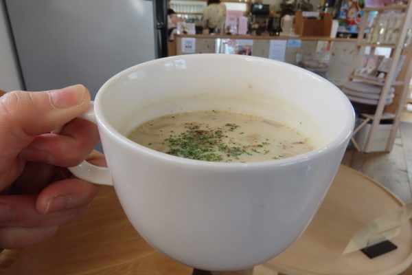 ふじさんの最近のお気に入りは、豆乳スープ。タマネギ麹は店内で発酵させてるそうです。タマネギ、ベーコン、あとは季節のきのこを数種類。たっぷり具の入った豆乳スープはまろやか。食べ終わった後、程よく塩味が口にひろがって心も体も休まります。たっぷり召し上がって欲しいからと大きなスープカップを使用しているそうです。