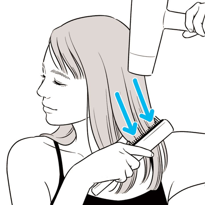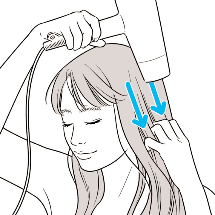 手ぐして髪を下に軽く引っ張りながら、ドライヤーを上から下に向けて当ててハンドブローします。