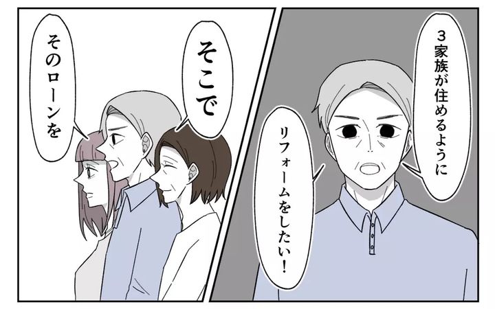 ・どんだけ厚かましいねん。甲斐性なしの旦那と寄生虫家族。ローンも組めないなんて、貯蓄もあらへん資金もない。3世帯住宅なんぞ贅沢なもん建てようとすんな。嫁ただの負担しかなく、メリットゼロ。縁切り確定案件です。