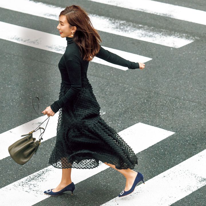 TSURU定番のローヒールパンプス。肌馴染みがいいスエード素材で履き心地が良く、頼れる一足。パンプス[H5㎝]¥31,900(ツル バイ マリコ オイカワ)ニット¥9,900(アンクレイヴ スタンダード/オンワード樫山 お客様相談室)スカート¥22,550(アルページュストーリー)バッグ¥165,000(J&M デヴィッドソン/J&M デヴィッドソン カスタマーセンター)ピアス¥49,500リング[右手]¥133,100(ともにマリハ)リング[左手薬指]¥90,200(アナプノエ/フォーティーン ショールーム)リング[左手中指]¥19,800(masae/ロードス)