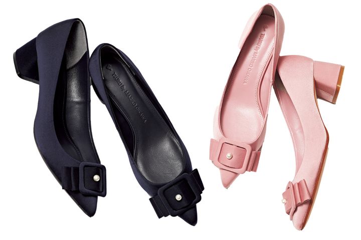 5㎝のチャンキーヒールは安定感と歩きやすさ抜群。愛らしい上品なデザインできちんとしたシーンにも最適。左から ネイビーパンプス[H5㎝]¥31,900ピンクパンプス[H5㎝]¥31,900(ともにツル バイ マリコ オイカワ)