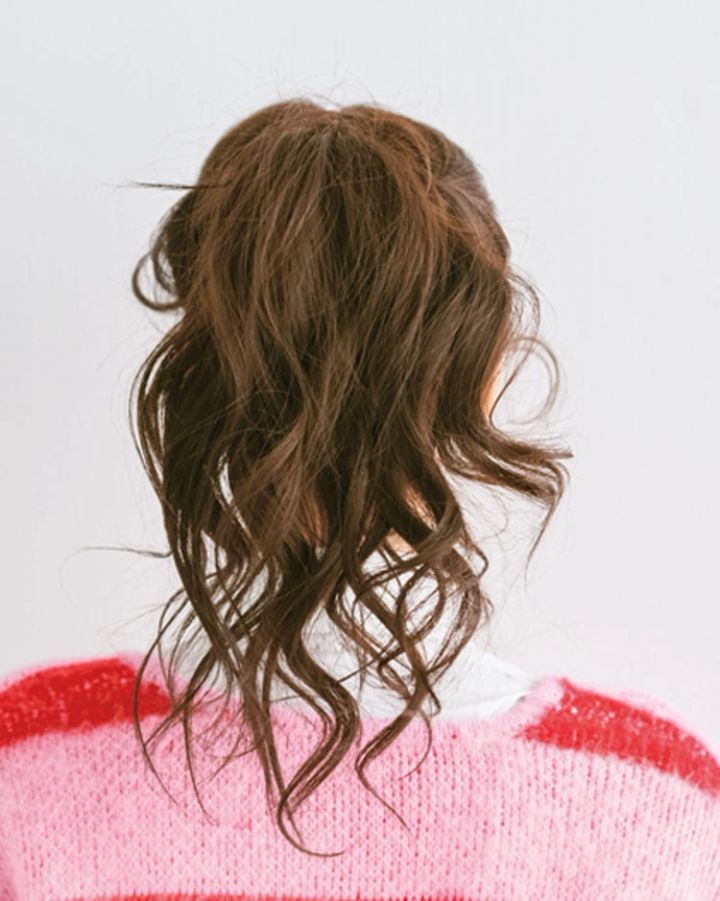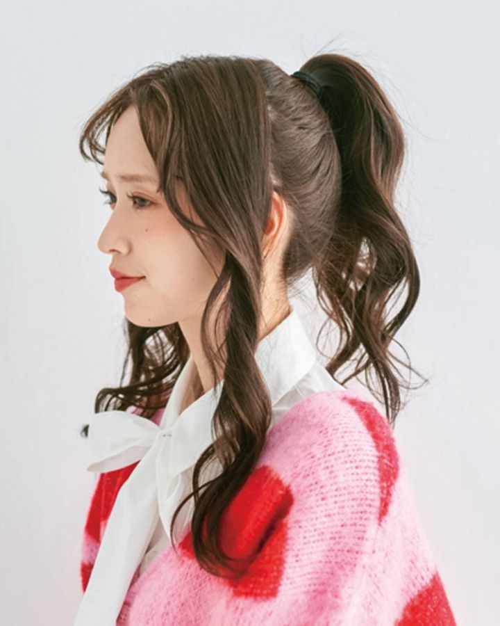 髪全体をゆるいミックス巻きにしておく。両サイドとも耳上の髪を残し、それ以外を後頭部の高め位置でゴムで結びポニテにする。