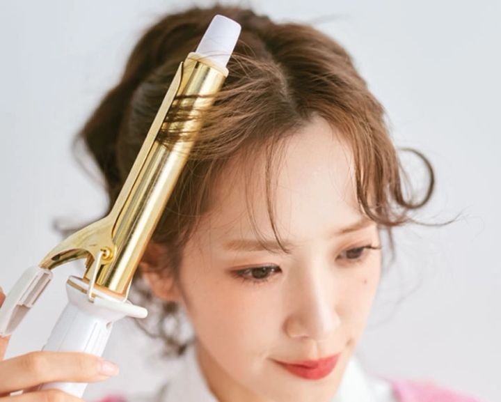 前髪はセンターで分けてから26㎜のアイロンで外巻きに。耳上の髪のねじった部分につなげるようなイメージで前髪をカールさせて。