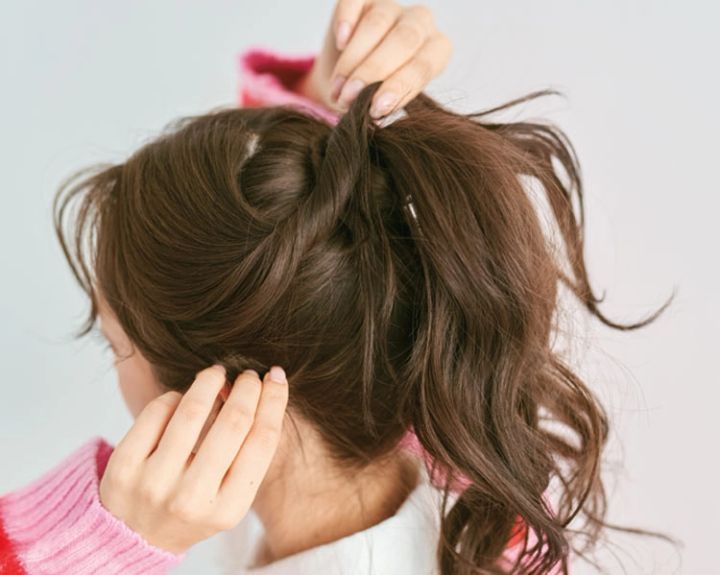 1で残した耳上の髪をねじり、ポニテの結び目の上から1回巻きつけてピンで固定。余った毛先はそのままま下ろす。反対側も同様に。