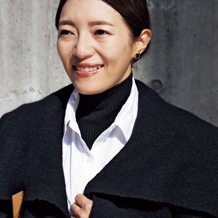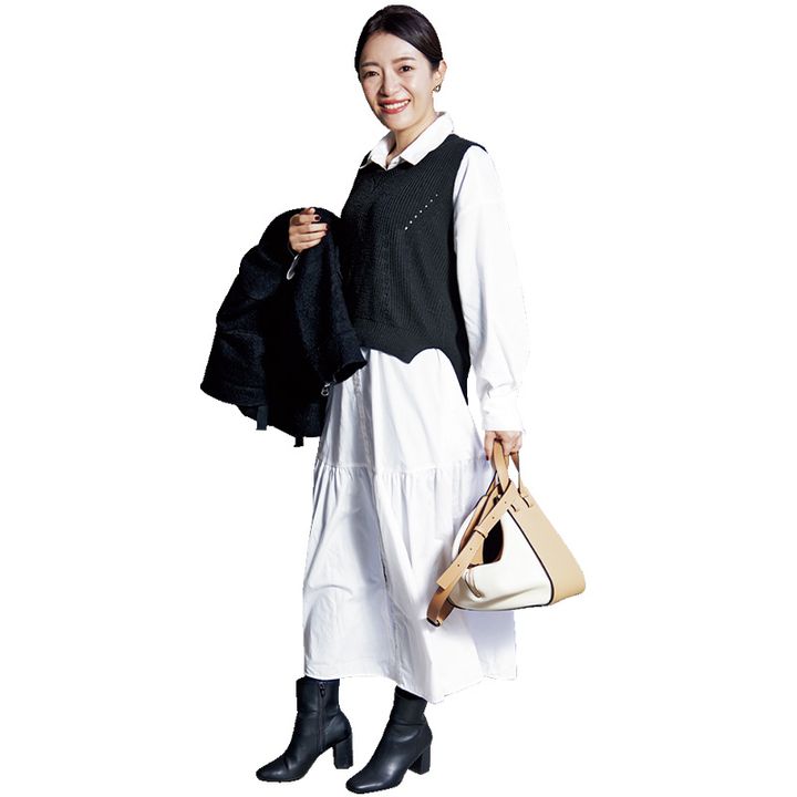シャツ¥25,300(ザ ハンサム/UTS PR)ニット¥12,100(ミースロエ/ミースロエ ルミネ新宿1店)ジレ¥18,700(N.O.R.C)コート¥97,900(イレーヴ)パンツ¥36,300(ロエフ/エイチ ビューティー&ユース)ピアス¥104,500(ヴァンドーム青山/ヴァンドーム青山 プルミエール 伊勢丹新宿店)バッグ¥108,900(ポロ ラルフ ローレン/ラルフ ローレン)パンプス¥33,000(ファビオ ルスコーニ/ファビオ ルスコーニ 伊勢丹新宿本店)