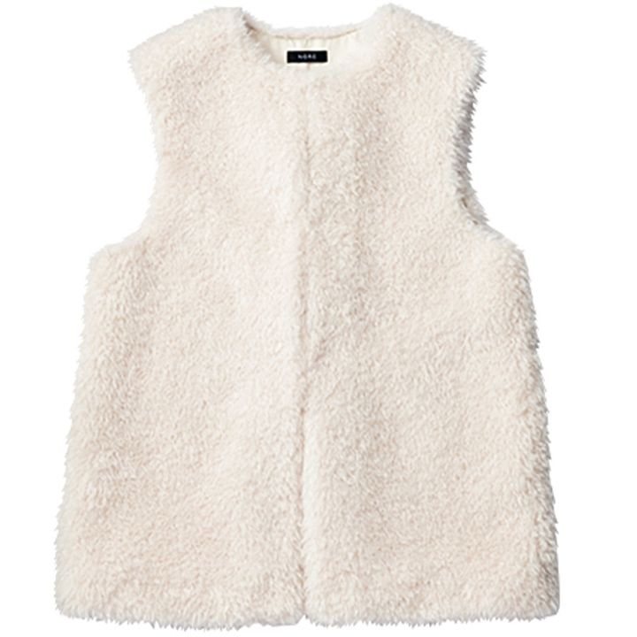 華やかシーンの主役になってくれるボアも、ベストならシャツ&ウールコート合わせでお仕事仕様。ベーシックな通勤コーデにもこもこの素材感が、今っぽいアクセントに。
