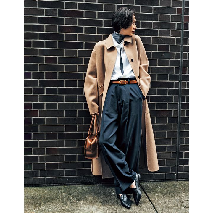 シャツ¥36,300(エイトン/エイトン青山)ニット¥25,300(コンテ/コンテ 青山店)パンツ¥39,800(TEECHI)コート¥121,000(ebure/リトルリーグ インク)ベルト¥8,800(LEFIJE/フラッパーズ)ピアス¥133,100(Hirotaka/ヒロタカ 表参道ヒルズ)バッグ¥209,000(J&M デヴィッドソン/J&M デヴィッドソン カスタマーセンター)シューズ¥35,200(ファビオ ルスコーニ/ファビオ ルスコーニ 伊勢丹新宿本店)