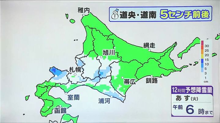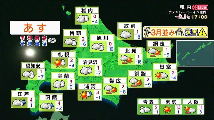 道北や道央、道南で雪や雨が降るでしょう。朝は北見で‐16度まで下がりますが、日中は広くプラスで、3月並みです。雪の多い地域では落雪などに注意して下さい。