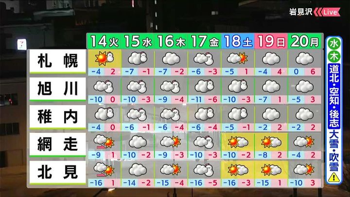 水曜から寒気が強まり、水曜と木曜は道北や空知、後志を中心に雪や風が強まります。金曜は札幌やオホーツク海側が雪の中心になるでしょう。土日は穏やかに経過します。